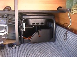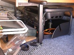Aquí tenéis unas fotos, donde se ve en el maletero ( aprovechando un hueco ) y encima de la mesa. También se aprecian las ruedas y uno de los tornillos del paravientos