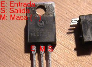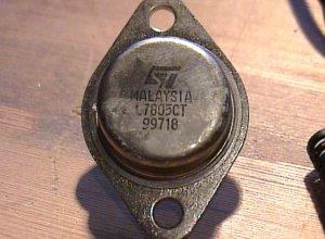 | 7805 , a la entrada conectamos los 12 V de la batería, a la salida tenemos los 5 V para alimentar el GPS o el PDA, y en la masa tenemos tanto la entrada como la salida del negativo ( o masa ), es muy conveniente usar un radiador. | Aqui tenemos otro 7805, en formato TO3, este es mucho mas conveniente si queremos alimentar el GPS y el PDA al mismo tiempo |
