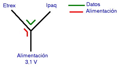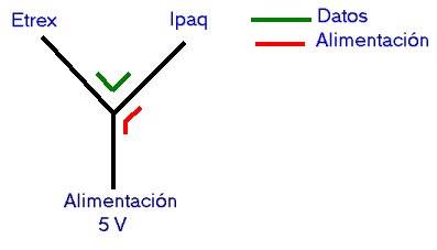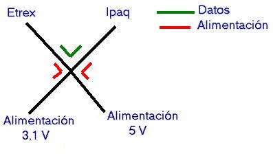 Si queremos añadir alimentación a estos cables tendréis que hacer una Y, si queréis alimentar solo un aparato o una x si queréis alimentar ambos. Para alimentar el etrex ya ha quedado claro que son 3,1 V y por donde se alimenta, para el Ipaq son 5 V y las patillas para alimentación son la 1 y la 2 para positivo, y la 4 y/o la 10 para masa. Para el ipaq 38XX el positivo es por la 1,2,3y 4 y la masa por la 10 y/o 15.