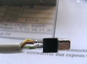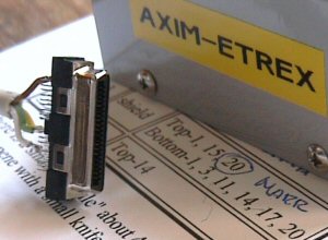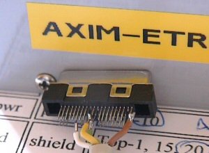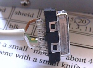 | Lo hice siguiendo el esquema de la pagina mencionada ( se ve la pagina de fondo ) y resulto que estaba mal, y cuando hice la corrección se me olvido hacer las fotos. | Aquí tenemos una vista de los conectores, en este caso la alimentación y el cable que va a la Axim |