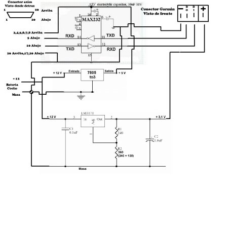 Para la alimentación necesitamos dos tensiones de salida partiendo de los 12 V, 3,1 V para el etrex y 5 V para la axim, aunque después de terminado todo descubrí que el alimentador de serie de la Axim da 5,5 V, pero con 5 V hemos comprobado que carga perfectamente, estos 5 V los utilizamos también para alimentar el Maxim232 .
