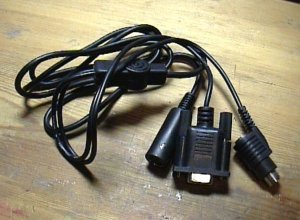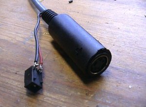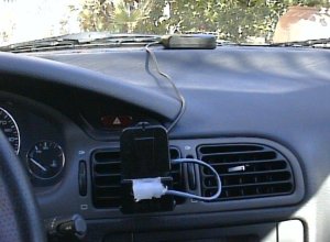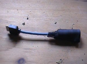 | Aquí tenemos el cable completo, listo para conectar, lógicamente el cable va lo mas escondido posible por el salpicadero, va desde el centro hasta el lado dcho, por el que baja y por debajo de la guantera va hasta el aireador que es donde ha puesto el soporte del PDA, la alimentación la ha cogido de unos cables de al lado de la guantera | Aquí vemos el conector del Ipaq y los cables que conectaremos o bien a algún punto del coche con 12 V o bien a una toma de mechero para conectarlo al mechero. |