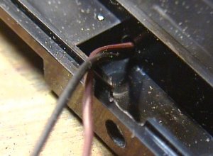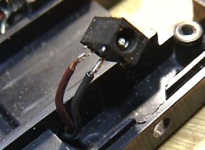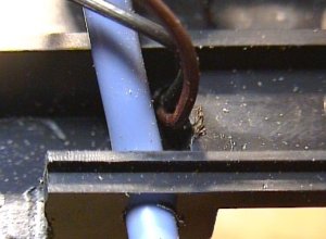 | Aquí vemos como pasan los cables de alimentación de un lado a otro y la salida hacia el PDA | Salida de los cables en detalle , se puede ver también que le he quitado un trozo al soporte |