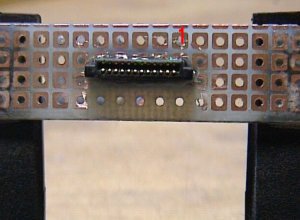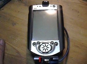 | Visto por el otro lado | Una vez soldados lo hilos ponemos el ipaq en el soporte con el conector puesto y pegamos la plaquita al soporte |