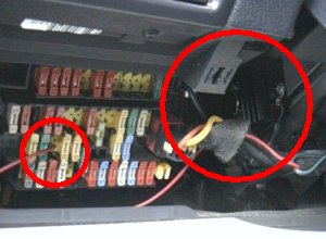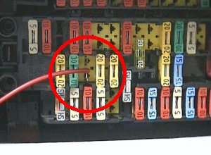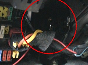 | De aquí he cogido el positivo + 12 V, en mi caso he optado por permanente, sin pasar por la llave de contacto, he utilizado un trozo de fusible al que le he soldado el cable. | La masa la coge del armazón en el que esta atornillado ( aprovechando unos agujeros que había :-) ) |