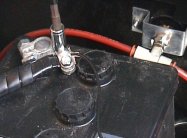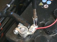 A continuación quite las pinzas del cable que trae el ondulador, pele las puntas y los conecte cada uno en su borne de la batería, antes había conectado los otros extremos al ondulador, para evitar cortocircuitos provocados por el terminal positivo, cosa a tener en cuenta también al trabajar con el borne positivo de la batería, hay que evitar tocar masa con la herramienta que estemos utilizando.