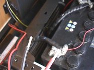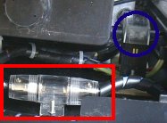 Así quedo la instalación una vez puestos los cables en las bornas, lo que aparece en el circulo es el fusible que traen los cables, como se puede observar, queda accesible y el ondulador queda detrás del asiento, totalmente accesible, después ya lo único que nos queda es volver a montar el asiento y llevar un cable desde el ondulador hasta el sitio donde habitualmente vamos a utilizar los 220 V y poner allí una base (en mi caso de superficie) para enchufar lo que deseemos, por supuesto hay que procurar que ese cable vaya oculto, bien sea siguiendo la instalación eléctrica ya existente o bien ocultándolo lo máximo posible.