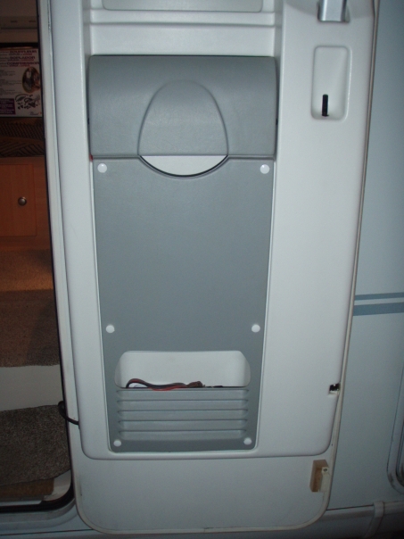 La puerta tiene debajo de la ventana un "bolsillo" con su cierre, y de hay hacia abajo nada mas, va cubierta con un plástico que incluye el bolsillo, va sujetada con unos simples velcros, así que un día tire del plástico y la desguarnecí, entonces vi que se podía aprovechar un hueco, para ello solo me quedo ver donde hacerlo, este punto es en las ondulaciones de abajo, si tienes una puerta igual solo tienes que ver las fotos para saber donde tienes que hacer el agujero, yo lo hice con una sierra caladora, habiendo forrado previamente buena parte de la puerta con cinta americana, de forma que la caladora no haga marcas en el plástico.