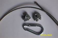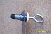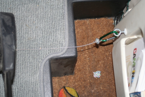 Para evitar tener que destapizar la puerta he usado un taco que ya trae incluida la anilla y se pliega hacia la anilla al ir enroscando esta, en la primera foto lo podéis ver, aunque no me ha salido muy bien. Por la abertura que queda para que salte la alarma no cabe mi mano, a lo mejor una mas pequeña puede ser, pero para poder sacar el mosquetón hay que prácticamente cerrar la puerta, pues el balancín del mosquetón esta mas atrás, por lo que se me antoja casi imposible de quitar desde fuera. Para evitar que lo puedan quitar fácil en caso de rotura del cristal de la ventana lo he puesto a nivel del suelo de la cabina, pero desde dentro se quita y se pone fácilmente . Las dos ultimas fotos están hechas antes de cortar el sobrante del cable de acero, por lo que se ven dos cuando solo es uno.