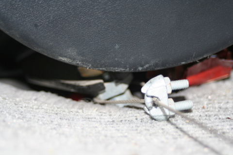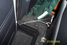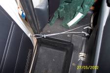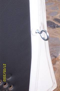 Aprovechando un agujero que trae el soporte del asiento le he pasado un cable de acero de 4 mm, y lo he "atado" , en el otro lado le he puesto un mosquetón, también "atado", a la distancia justa para que permita abrir la puerta hasta que se active la alarma, ni mas ni menos. La parte dolorosa viene al tener que hacer un agujero de 10 mm en la puerta, donde he puesto un taco que incorpora una anilla, en esa anilla se engancha el mosquetón cuando la queremos bloquear. El conjunto es muy sencillo y rápido de realizar, y el ajuste también.