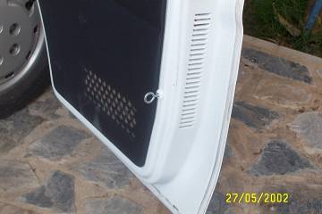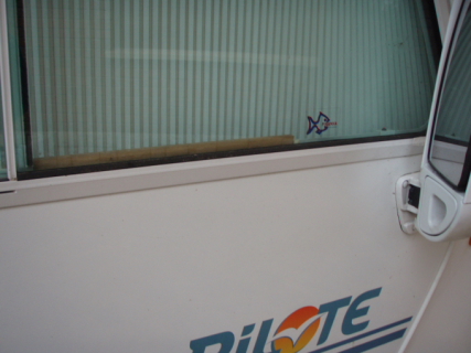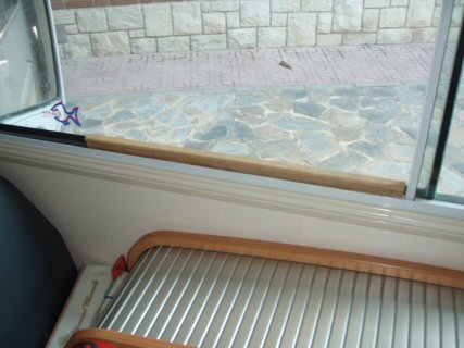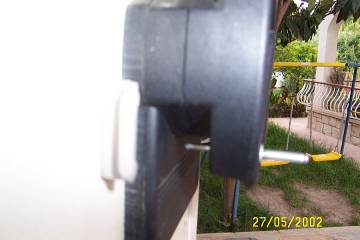 Un problema nuevo que me surgió es que al poco de tener la auto, con la alarma a medio montar, me abrieron la ventana del pasajero, fácilmente, por suerte no rompieron nada ( el cierre se desmonto ), no entraron pero si que alcanzaron a llevarse la tv de 7" que utilizaba como retrocamara, por fortuna no se llevaron la pda, junto al monitor, pegada, ni nada mas. Ante eso recordé que J@vi ponía un listón, y eso es lo que hice, hace poco ( 2008) otra vez consiguieron abrir, porque cedió la goma, así que la fije con un tornillo largo, al cual le puse un cubre tornillo para que quedara curioso.