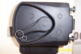 Para la puerta del habitáculo la cosa es mucho mas sencilla, solo hay que hacer un taladro de unos 2 mm en la manivela y lo que queda debajo de esta, en la posición de bloqueo de la cerradura. Para evitar posibles holguras es mejor hacer el agujero bajando un poco mas de su posición de reposo la maneta y entonces taladrar las dos piezas, la maneta en realidad aun baja mas, pero si la soltamos vuelve a lo que yo he llamado posición de reposo. En la segunda foto se ven los agujeros, hacerlos de una sola vez. Después solo nos queda introducir un remache de 2 mm por la parte fina , atravesando los dos agujeros, con lo que será imposible abrir la puerta, Lo mejor es que busquéis un remache lo suficientemente largo como para que pase el conjunto y que tenga una cabeza lo suficientemente larga para poder ponerlo y quitarlo cómodamente, una vez que tengáis el remache medir el diámetro del "clavo" y hacer los agujeros del mismo diámetro.