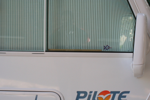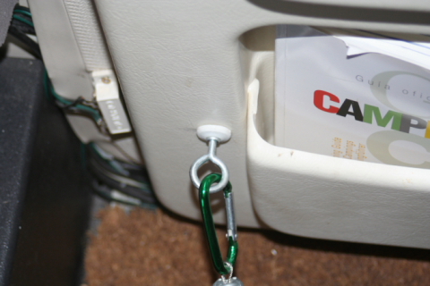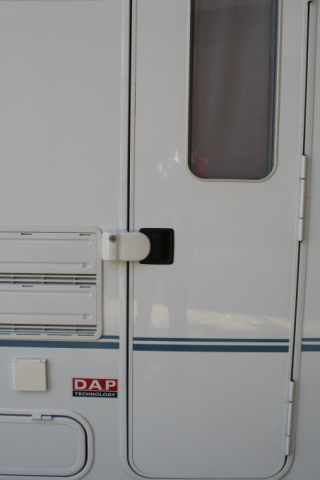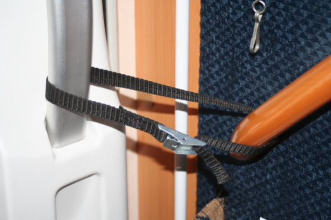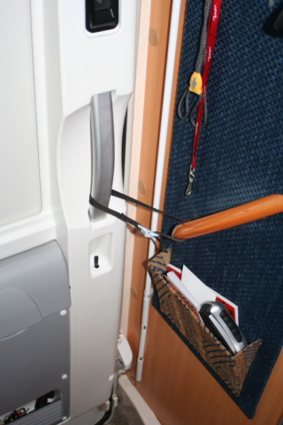 Cuando paro a pernoctar en lugares considerados como mas peligrosos ( areas de autopista p.e. ) o que a mi me lo parezca y no quede otra, lo que hago es que aprovechando la ventana de la puerta coloco la galleta (safe door) desde dentro, eso si, atando las llaves con un llavero con cable extensible que consegui, esto no tiene la mayor importancia, siempre podemos salir a recuperarlas por la otra puerta, pero me da mas tranquilidad. Tuve la precaución cuando monte el safe-door de colocarlo de forma que me cubriera la cerradura.
