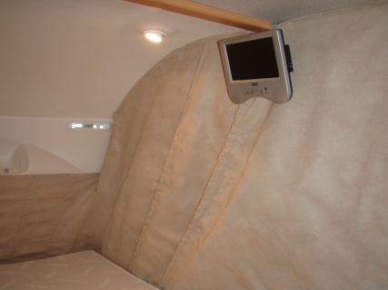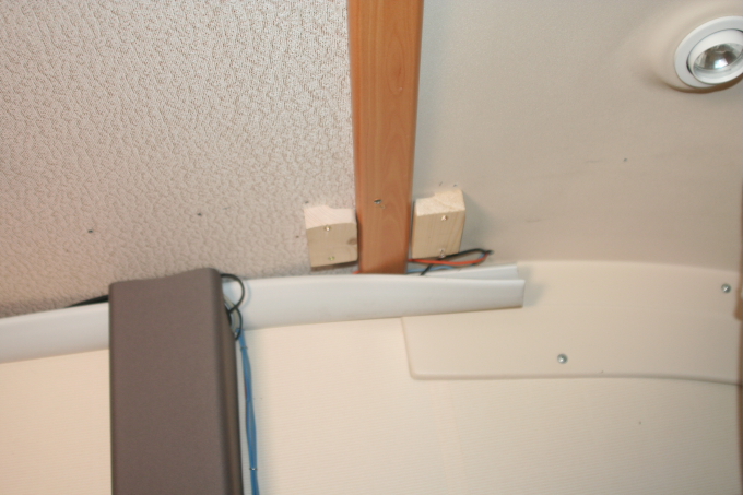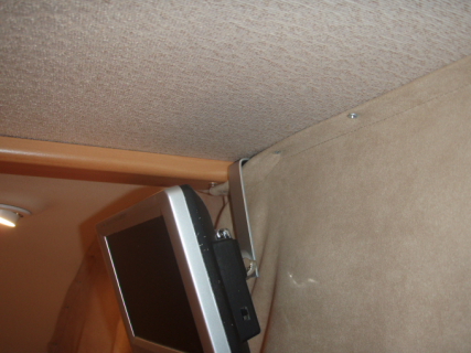 También llevo una TV de 7" que utilizo como monitor para las cámaras traseras, cuando paramos a dormir la quito de la cabina y la ponemos en la cama, acostumbramos a dormirnos viendo la TV, como dormimos de un lado u otro dependiendo de la inclinación de la auto, y hay una tela cubriendo los laterales, y el soporte no se puede quedar fijo pues impediría recoger la cama, pues aproveche que hay una madera que crea un pequeño hueco en la sujeción de la tela, con un perfil de aluminio hice una base para sujetar la tele a su soporte original, del que solo utilice la parte que lleva la rotula ( para orientarla a gusto y fijarlo ), y para colocar el soporte lo que hice fue coger un taco de madera, y rebajarlo por uno de sus extremos de manera que fuera un pelo mas ancho y mas alto que el perfil de aluminio ( si no se tiene la madera de guía habría que hacer el rebaje en el centro del taco ), y lo fije por detrás de la tela al techo, os señalo que cuanto mas largo sea el trozo de aluminio que introducimos mas estable será la TV, ya solo queda poner la TV en el soporte y el soporte en el lado que nos interese ( puse otro taco en el otro lado ).