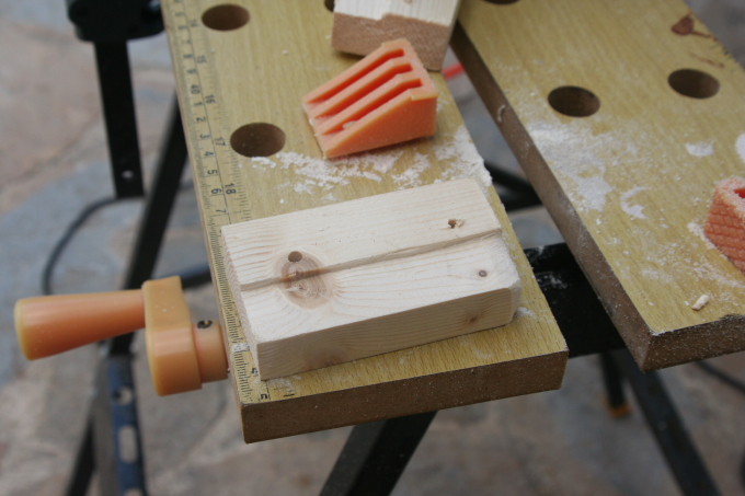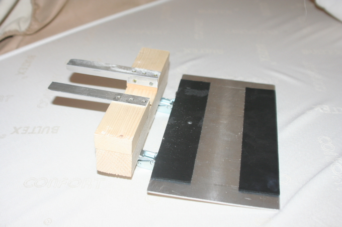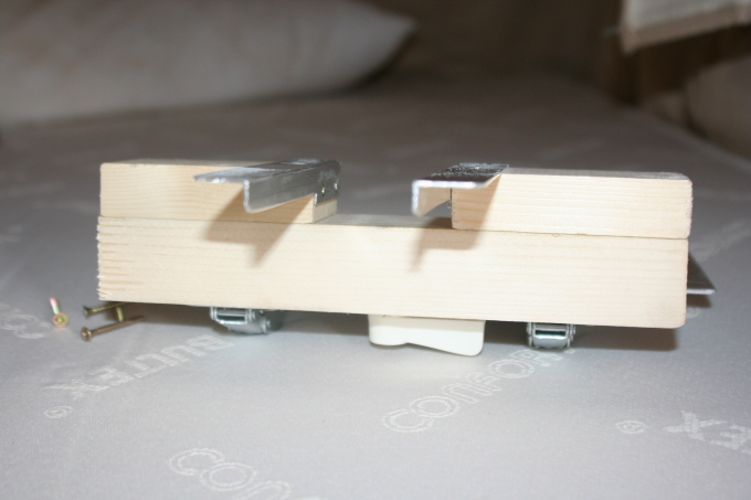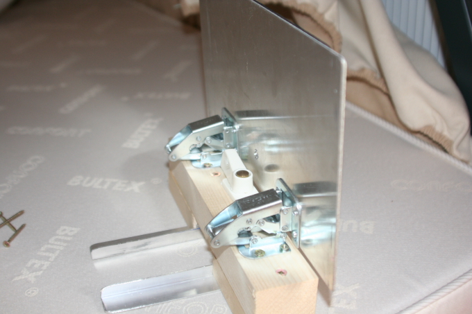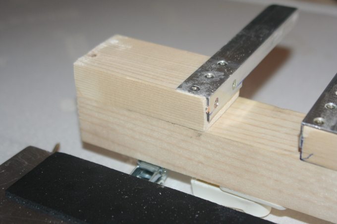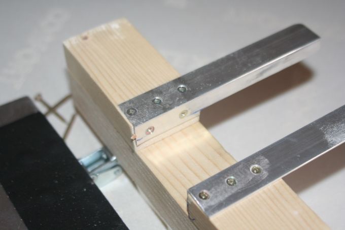 | Vista del soporte, por un lado son dos trozos de listón a los que he cogido dos L de aluminio, el trozo esta rebajado para que el perfil de aluminio no sobresalga, también avellane los agujeros y después lime los tornillos para que no sobresalieran nada, también en los laterales | Los dos trozos los cogi a otro trozo de listón, a la medida de forma que la TV quepa una vez plegada |