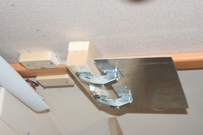 Necesitaba que se quedara plegado contra el techo para no tener que quitarlo y ponerlo cada vez, que fuera algo rápido. He utilizado unas bisagras de puertas de cocina que encontré en el AKI y he realizado un montaje similar al que tenia con la anterior TV ( para poder cambiarla de lado ) pero mas resistente porque a la hora de plegarlo hay que hacer mas fuerza, no es solo sujetarla.