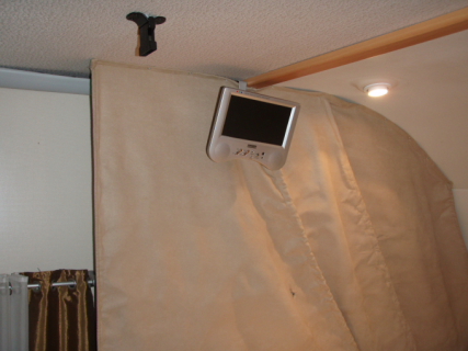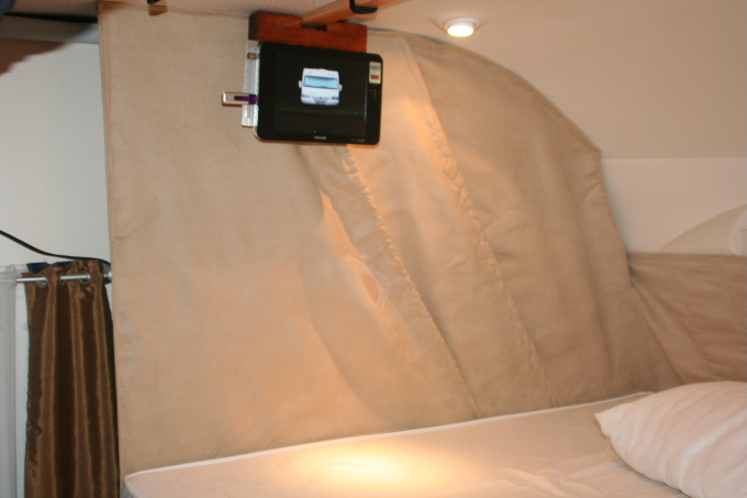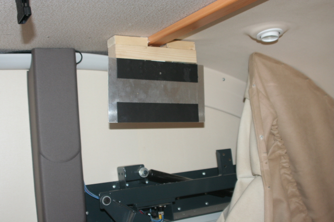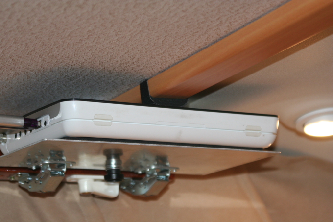 | Detalle plegado, con un velcro de los del tipo de agrupar cables, pasándolo entre la madera y el techo, he puesto un trozo de espuma de alta densidad para evitar golpecitos en la madera, todo cabe perfectamente con la cama plegada | Vista del conjunto, faltan los cables de alimentación, de antena y de video, ( la TV tiene batería de 2 Horas ), los he hecho a medida y los he cogido al centro de la plancha, de esta forma va todo junto cuando lo cambio de lado, y mientras lo puedo tener siempre conectado, aunque la cama este plegada. Por lo tanto el objetivo esta cumplido, solo tengo que bajar la cama, bajar la TV y a verla, mas cómodo no se me ocurre. |
