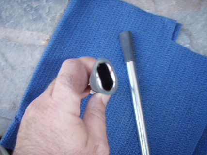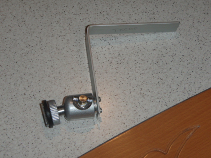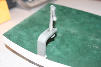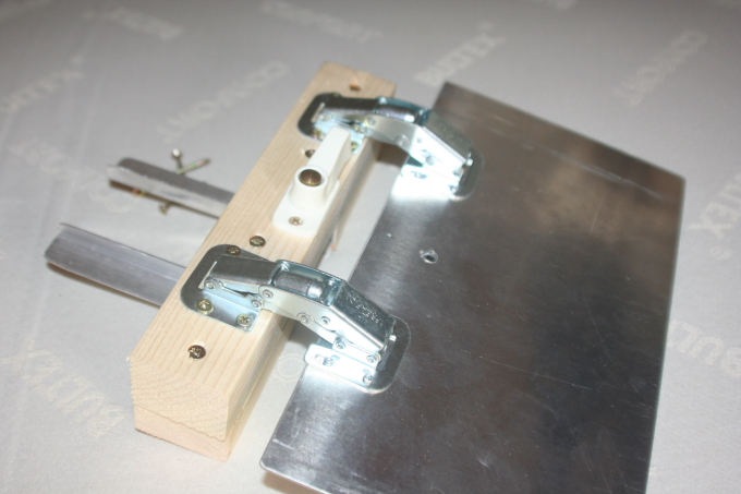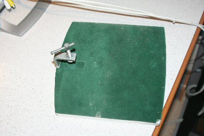 Tenia una pieza de un soporte de marquetería, le hice dos agujeros para pasar dos tornillos, y como pude lo avellane, de manera que los tornillos quedaran un poco por debajo del nivel del metal.