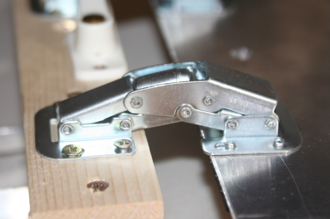 | Vista de la bisagra plegada, atornillada al listón y remachada a una chapa de aluminio | Bisagra extendida |