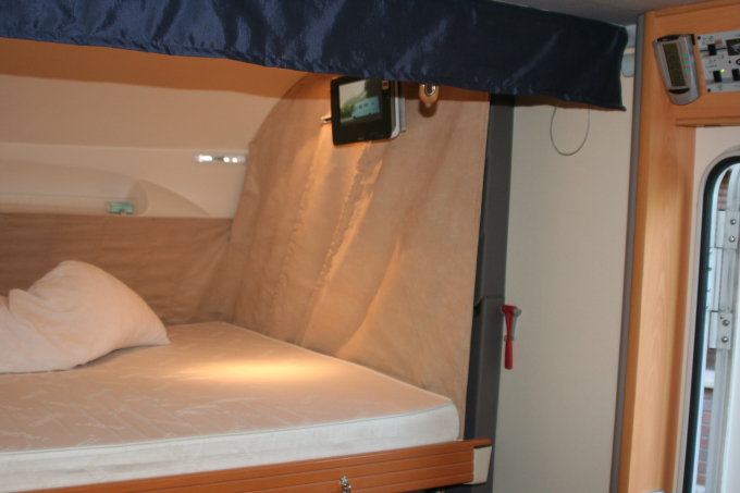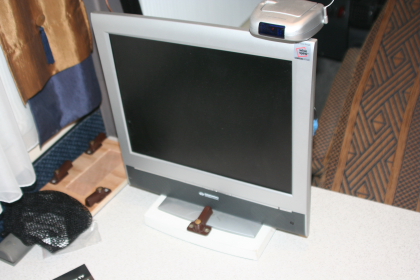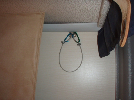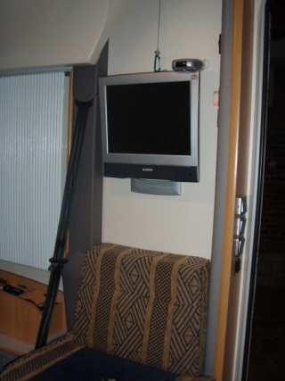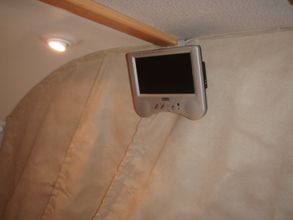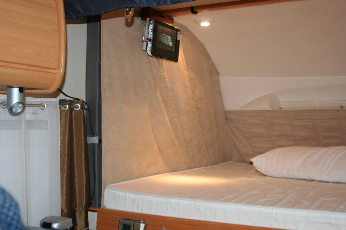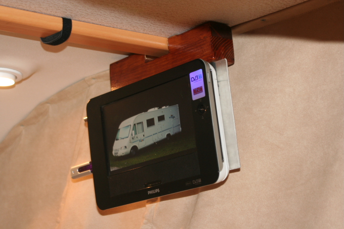 Para otras ocasiones en las que estamos mas tiempo que una parada tengo puesto un enganche al que cuelgo la TV, a la TV le puse un cable de acero por detrás con un asidero de forma que la llevo de un lado a otro cómodamente, pues bien, pliego la base de la TV y la cuelgo con un cable y dos mosquetones, cuando la TV no esta no se ve nada, lo oculta la cama, el cable con los mosquetones lo hice de la longitud apropiada.