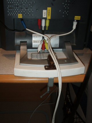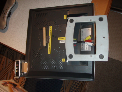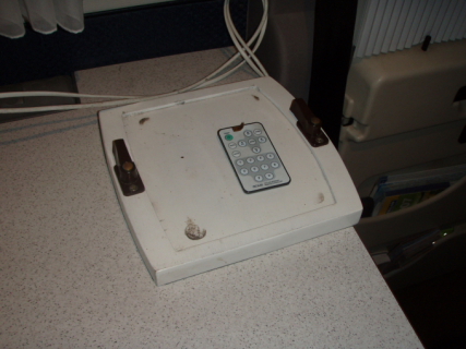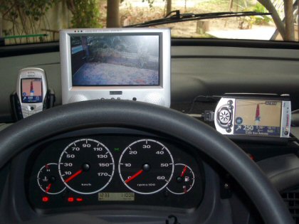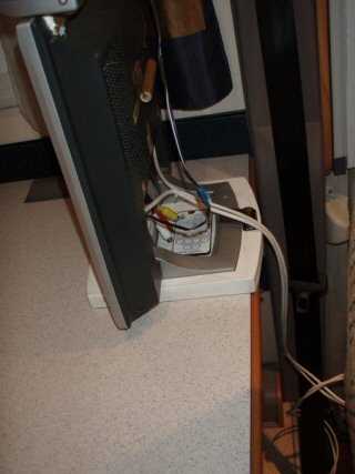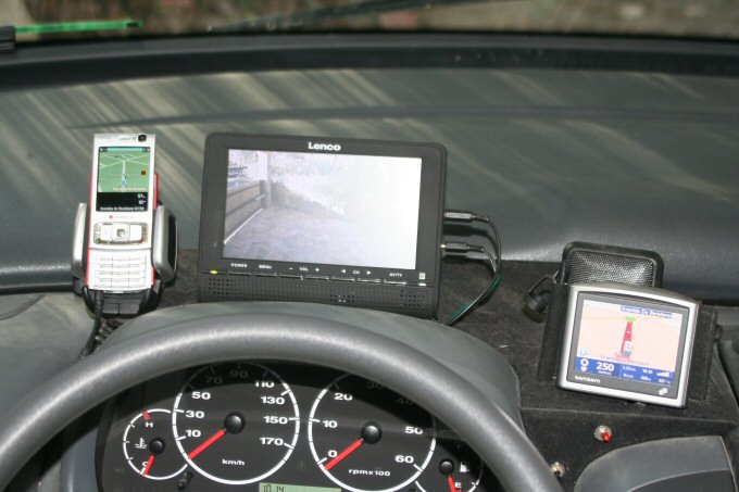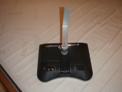 Bueno, pues este verano ( Julio 2009 ) en pleno viaje por Alemania el monitor dijo que hasta aquí había llegado, como estoy acostumbrado a conducir con las cámaras en cuanto pude compre un monitor TV, en este caso compre un Philips de 8" con TDT incorporado, entrada de video, USB y DVD, se ve genial, pero una vez en su sitio en el salpicadero no me convencía, muy grande y varios pasos para ponerlo en marcha, así que me rondaba la cabeza el comprar otro, pero tampoco quería gastarme mas dinero, pero vi una en el carrefour de 7" por 80 € , y me entro el gusanillo, entre en la web para ver las características y la encontre por 49, así que me decidí y la compre, ahora esta montada fija en el salpicadero, es al mismo tiempo TV, pero analógica, por lo que dentro de poco no sirve como TV. Entonces pensé en dejar la Philips en el dormitorio, vi algunos soportes comerciales, pero ninguno servia, así que me lo monte yo mismo, cuando volvemos a casa la uso en la cocina, con un soporte como el que tenia antes en el dormitorio de la auto.