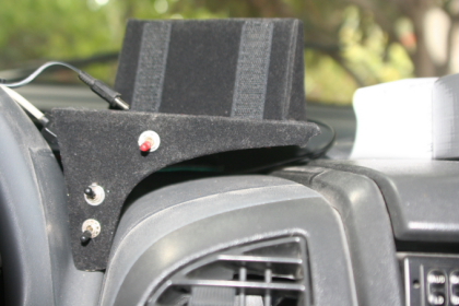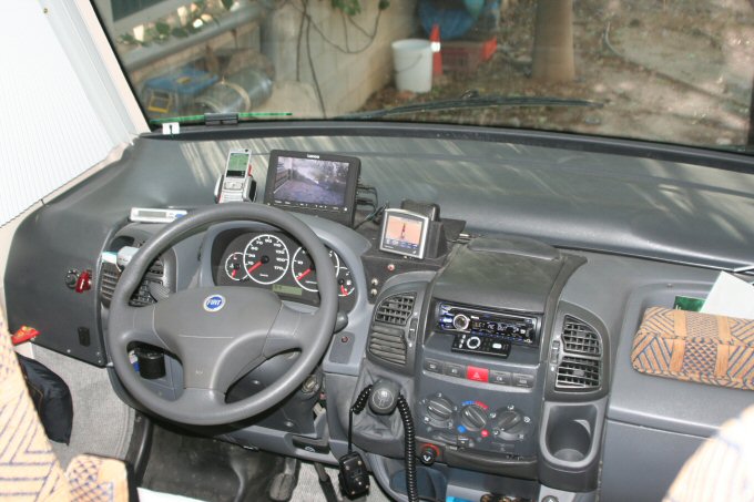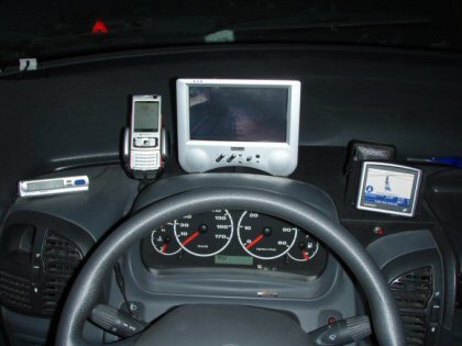 Y ya para terminar, la TV TFT de 7" que utilizo para dormir y para las retrocamaras, pues en el uso como retrocamara la fijación es muy sencilla, un perfil en T doblado en L fijado sobre una base que me hice, en la cual además llevo el soporte del móvil ( también lleva navegador ) el TT One ( antes la PDA ) y un altavoz de la emisora de 27. Los interruptores que se ven son de arriba a abajo, el cambio de camara ( aparcar o retrovisor ), encendido del monitor, y general para el monitor, cargador del movil, PDA o TT one, GPS externo tipo mouse y convertidor serie bluetooth ( va conectado al gps externo y me permite usarlo como serie y bluetooth al mismo tiempo ).