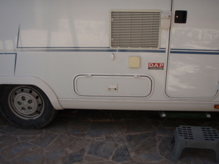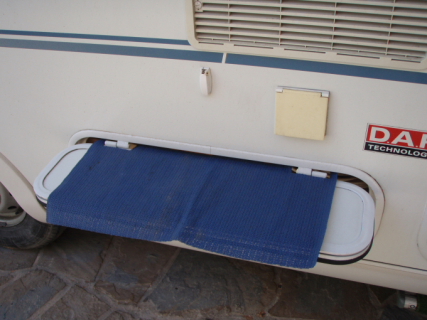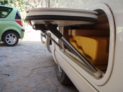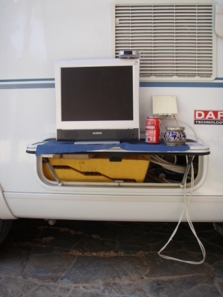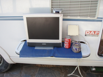 Para los veranos, cuando estamos en camping y apetece cenar a la fresca o comer bajo el toldo o sombra natural, pues aproveche que como mi auto es de doble suelo, y lleva varios portones, y da la casualidad que tengo uno justo en el sitio ideal, a la altura ideal ( esto es importante ) y en el mejor sitio donde podía instalar la toma exterior de corriente y antena, pues la solución fue fácil, tenia que fijar el portón en horizontal, y la forma que se me ocurrió para que no me quitara sitio al cerrar el portón fue coger dos compases y cortarlos, de manera que después pudiera insertar dos tubos, y que no ocuparan sitio, pues los pliego ( si te bailan los puedes "forzar" con unos golpecitos en el remache hasta que vayan duros, lo justo ), los dos tubos los corte a medida para que quedara en horizontal el portón, el tubo era de un diámetro inferior, pero al chafarlo daba la medida para entrar en el compás, le puse dos tapones por el otro lado, y corte un trozo de tapete antideslizante a la medida del portón, de forma que no se pueda rallar, ya solo queda conectar la TV y a disfrutarla, como queda sitio se puede usar para poner el cenicero y la cerveza :-)
