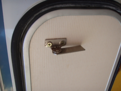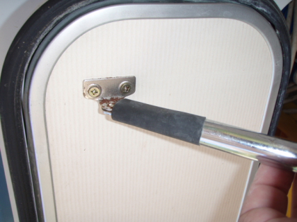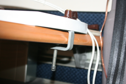 Ya tenia el soporte cogido a la mesa, ahora me quedaba fijar la TV al soporte, y nada mas sencillo que poner dos retenes de los que se usan en las caravanas y autocaravanas.