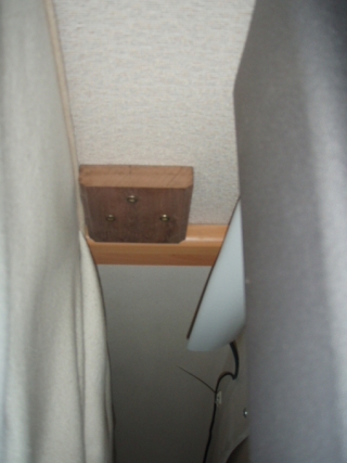 | Esta es una de las piezas sobre las que se cojera el soporte, va rebajado para que ente la L de aluminio y los cantos agrandados para facilitar la introducción del soporte. | Pieza puesta en su sitio, para colocarla he puesto un trozo de L pegado a la madera y el techo y entonces he fijado la pieza que he hecho, dejando un pelin de holgura, por eso no esta pegado a la madera. |