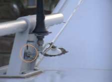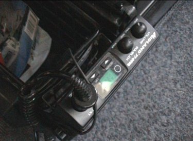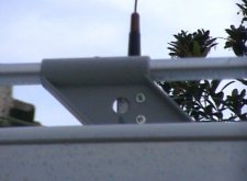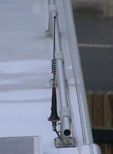 La instalación de antena que tengo no es la ideal vista desde el punto de vista de rendimiento, pero es lo que mas se acercaba a mis intenciones, que la antena fuese en el techo y fija, por lo que por motivos de altura, monte que la antena mas pequeña que encontré, siempre es recomendable una antena lo mas larga posible ( de las que venden para esa frecuencia ), situada lo mas centrada en el techo posible y a nivel de este ( en el mismo plano ), por razones lógicas yo la monte en un lateral ( bastante me dolió hacer el agujero para sacar los cables ). Para fijarla utilicé un ángulo metálico que cogí a la vaca, y en el que además de fijar la antena, fije un cable de tierra traído junto con el de antena desde una buena masa ( circulo en naranja ) . Al medir las estacionarias , estas dieron un valor mas que correcto, mucho mejor de lo que esperaba. Este punto es muy importante, si os montáis una emisora, necesitáis ajustar o que os ajusten la antena, para esto es necesario un medidor de estacionarias, que por otra parte es barato (desde 2000 ) y donde lo compréis os enseñaran su uso, así como a ajustar la antena, siendo altamente recomendable, al menos comprobar que las estacionarias se mantienen dentro de unos márgenes cada cierto tiempo.