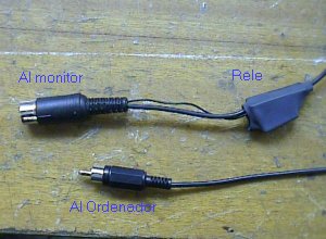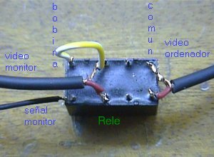 En las patillas comunes ( y esto ya es cierto ) soldaremos un cable de vivo y malla ( otro cable ) de la longitud que necesitemos desde el monitor hasta el ordenador, teniendo la precaución de que los vivos queden en el mismo circuito al que hemos soldado el vivo del otro, al igual que las mallas ( ver que los rojos quedan en la misma línea al igual que lo estañado ). Si no eres muy entendido, pide que te digan en la tienda de electrónica donde compres el rele, que te digan que es cada patilla y cuales son los dos circuitos en el rele que te vendan (hay muchísimos modelos, casi siempre con el común en el centro ).