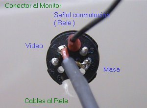 En la imagen siguiente vemos las conexiones al rele (12 V, doble circuito, dos contactos, lo mas pequeño que puedas comprar), donde soldaremos por un lado (el que pone bobina ) el cable que anteriormente hemos soldado al conector a una patilla de la bobina, y, lo siento pero no me acuerdo exactamente el cable de vivo + malla a las patillas del contacto normalmente cerrado o al de normalmente abierto, ( no existe ningún peligro, si lo montáis y no veis la imagen de la cámara, soltarlo y conectarlo en los otros ), y del cable de malla que acabamos de soldar unimos otro cablecito que llevaremos a la otra patilla de la bobina ( en este monitor la masa es común a video y alimentación ).