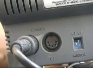 En la siguiente imagen vemos la parte posterior del monitor, con las dos entradas, en el conector que queda libre y que bajo pone C2, conectaremos el cable que haremos. Si con el montaje vemos las letras al revés ( como las letras de una ambulancia ), deberemos cambiar de posición el micro interruptor C2 que aparece en el recuadrito azul ( si esta abajo lo pasamos arriba o viceversa)