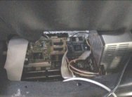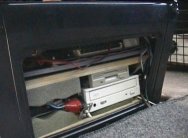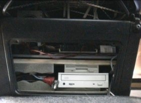 Aunque la foto no esta muy clara, creo que se observa que en la parte de abajo quedan la unidad de CD-ROM y la disquetera, y a su lado izquierdo en la foto podemos ver unas goma espumas grises, en medio de las cuales esta el disco duro, para evitarle en lo posible vibraciones, ( aunque de todas formas no suele trabajar , pues los mapas los llevo en CD y una vez en carretera las operaciones que realizaremos con el ordenador serán mínimas, por no decir nulas ), este disco a aguantado perfectamente todo tipo de carreteras, incluso empedrados, aunque como ya digo, apenas trabaja. En la parte superior va la placa Base y la fuente, en la siguiente foto, tomada desde detrás del asiento y con este en su posición mas adelantada lo observaremos mejor.