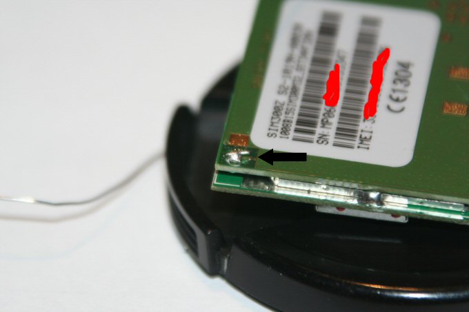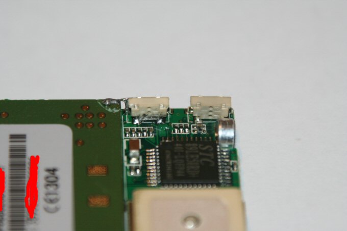 Y aquí es donde viene el problema, el aparato es pequeño y esta realizado en tecnología SMD que es muy pequeña, y los puntos sobre los que tenemos que soldar, al igual que toda esta tecnología, son muy pequeños, para complicar un poco mas las cosas no podemos desmontarlo por completo ( yo al menos no lo veía muy claro volver a soldar la antena si la desoldaba ), por lo que la posición de trabajo no es muy cómoda. Este problema del tamaño se soluciona utilizando un soldador de 15 W con punta de aguja, y estaño e hilo muy finos, yo por mi profesión tengo estos materiales, pero el que no sepa soldar bien, pero bien, o no pueda tener estos materiales le aconsejo que se dirija a alguien que se dedique a “tocar” las PSP y demás videoconsolas, pues todo esto es lo que utilizan ellos ( que quede claro que yo no me dedico a eso ) y no creo que os cobren mucho por haceros esas dos soldaduras. Como podéis ver yo lo que he hecho a sido sacar los dos hilos fuera y poner un conector.