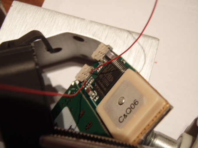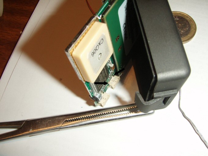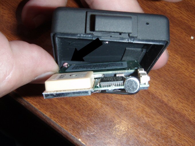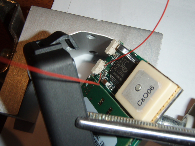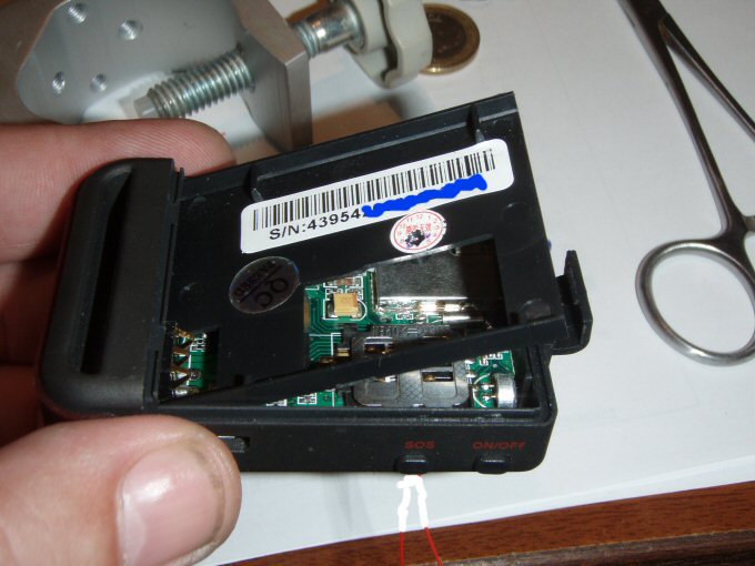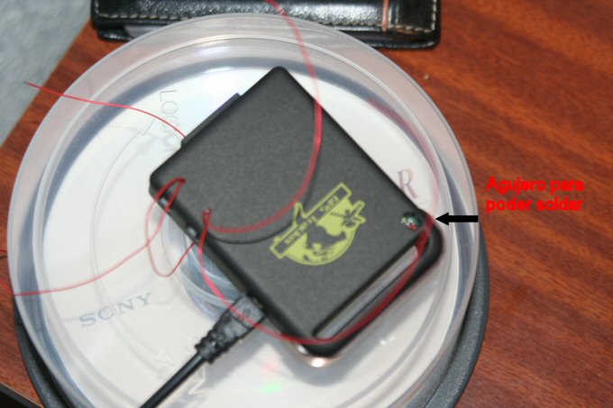 Con el localizador de Juanvi me surgió un problema, pues al abrirlo se soltó el famoso cable que yo decía que mejor no soltar, pues nada, en su momento no hubo manera de soldarlo, y no me quedo otra que hacerle un agujero, de manera que una vez la placa en su sitio, poder realizar la soldadura, tapar el agujero después no es mayor problema, un trozo de cinta americana o bien un poco de sikaflex y listo. Al realizar las soldaduras del pulsador de power no me quedo otra que quitar el micrófono, nosotros no lo usamos, entre otras cosas porque el localizador esta fuera de la auto, pero también es posible ( y en este caso fácil de soldar ) sacar un cable del localizador y llevarlo dentro de la auto y situar allí el micrófono, la única precaución es utilizar cable del tipo vivo malla. Como se soltó el cable, las fotos que he podido hacer salen mejor.