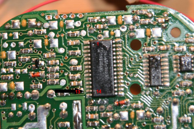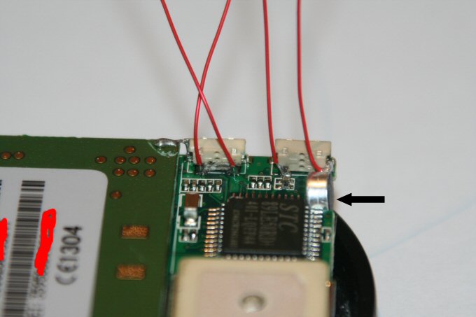 Posteriormente realice la misma operación con la alarma de mi amigo y compañero de viajes Juanvi, su alarma es una Patrol Line 738 Pro, y su alarma traía el PIC 16C63A, en su caso el PIC es SMD, y la patilla que da los 5V es la 13. Unos días antes, no se porque ( creo que si, pero como no estoy seguro .. ) me salto el localizador, y no había manera de resetearlo desde el teléfono ni podía apagarlo por estar escondido y yo fuera de casa, por lo que descarte llamar y dar instrucciones a la familia para que lo hicieran, pues bueno, estuvo enviando sms hasta que se quedo sin saldo ( unos 7 u 8 € ), antes esto y en previsión de que volviera a ocurrir decidí realizar la misma operación que hice con el SOS hacerla con el pulsador power, de manera que dejo un pulsador escondido pero accesible dentro de la auto y en ese caso ya podría avisar a la familia para que pudieran apagarlo.