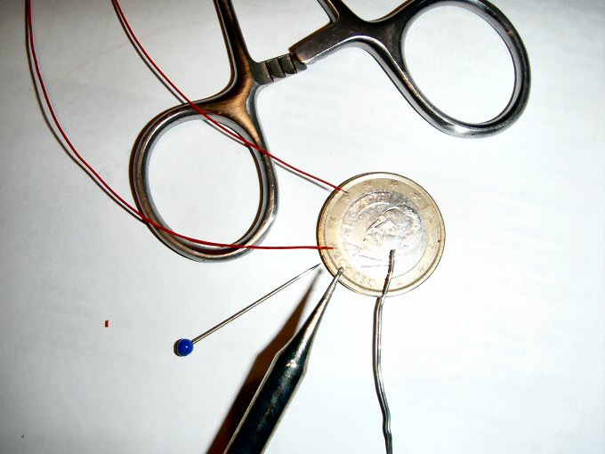Aquí los materiales, para que se aprecie el tamaño comparado con una aguja, observar que el hilo de estaño y el eléctrico son muy finos