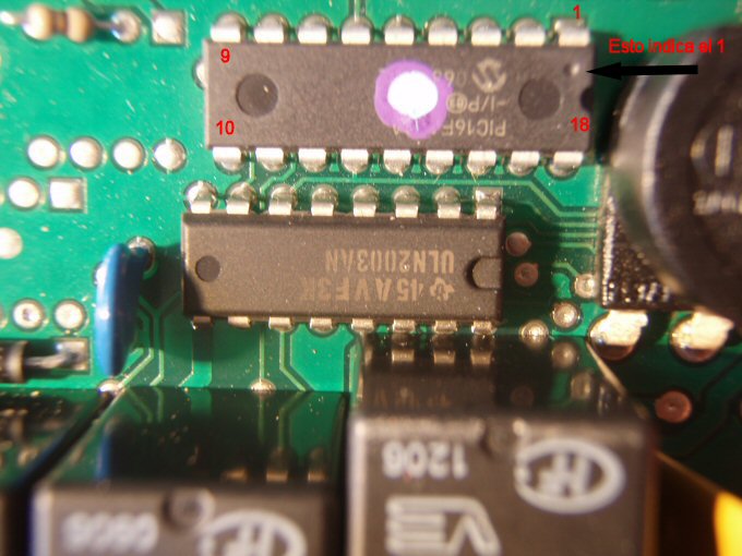 Aquí vemos el PIC, en mi caso el 16F628A , si tu alarma es otra marca pero lleva el mismo será la misma patilla la que habrá que utilizar, la mancha la podemos eliminar rascando suavemente y poco a poco hasta que quede visible la numeración del PIC, si es otro tendrás que hacer las pruebas que indico mas abajo. |