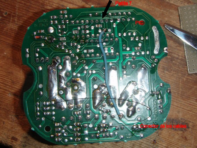 Aquí vemos donde hay que soldar el cable que llevaremos a un circuito auxiliar ( patilla 7 del PIC ), pues da 5 V y nos interesa que sea de 12 V, esto lo haremos con un circuito auxiliar. En mi caso el mazo de cables incluía el cable de salida auxiliar ( aunque no la función ), por lo que he aprovechado y lo he llevado al conector del mazo de cables y así ya lo tengo en el interior del habitáculo. En caso de que no tengas este cable tendrás que hacer una agujero para sacar el cable que hemos soldado a la patilla del PIC para llevarlo al circuito auxiliar. Sella con silicona o sicaflex la salida de ese cable. |