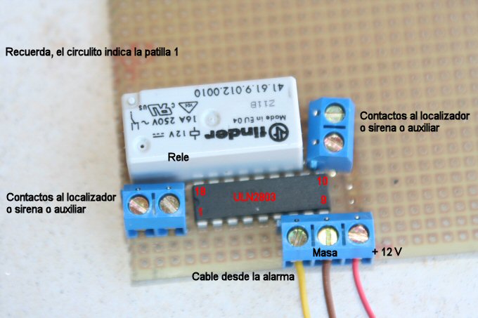 | El circuito conectado a la alarma y a los cables del SOS del localizador |