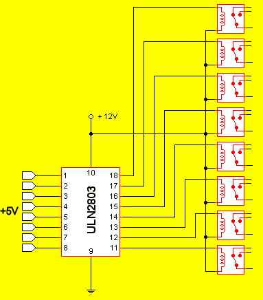 | Tipico circuito que con una señal de 5 V nos permite activar un rele de 12 V, solo tenemos que aplicar una señal de 5 V a una patilla y por la otra nos activa el rele de 12 V, el circuito que muestro es el tipico, es capaz de gobernar 8 reles, en nuestro caso solo es necesario 1 rele, y por comodidad he usado la patilla 7, y la salida es por la 12, si usamos la 1 la salida es la 18 ....., como referencia en el integrado es la del lado opuesto. |