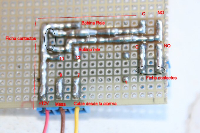 Bueno, pues si estas en mi caso, la cosa se complica, pero no esta todo perdido, hoy en día casi todas las alarmas son iguales, y casi todas están basadas en un circuito integrado del tipo PIC, en mi caso en concreto un PIC 16F628A . Yo lo que hice fue desmontar la alarma, y desolde los cables del altavoz ( si no te vuelves loco y molestas a los vecinos ) y me lo lleve a mi cuarto de los aviones ( nombre que le damos en casa a una habitación que tengo dedicada al aeromodelismo y la electrónica, vamos, un tallercito ), siempre puedes desmontar la alarma, desoldar el altavoz y conectar el mazo de cables en un lugar estable y accesible en la misma autocaravana, bien en el sitio o bien cerca de donde este puesta la alarma, y con la ayuda de un osciloscopio ( sirve perfectamente un polímetro ) y una batería de 12 V me puse a activar y simular una alarma de manera que buscaba un punto donde tuviera 5 V mientras que la alarma estuviera sonando ( no estaba el altavoz, pero se oye el rele que lleva para encender las intermitencias, si la has dejado en la auto veras las intermitencias ) ese punto lo buscaba en las patillas del PIC, media 3 o 4 patillas ( ojo, de una en una) y tomaba nota de los que daban 0 Voltios ( la medida siempre hay que hacerla respecto a masa, el cable rojo del polímetro a las patillas del pic y el negro a la masa ( - ) de la alarma o del vehiculo, lo mismo da , a continuación hacia saltar la alarma y los volvía a medir, así hasta que encontré uno que daba los 5 V ( ojo, los hay que están continuamente oscilando entre 0 y 5, esos no sirven, solo vale si al estar sonando y solo mientras esta sonando, se queda en 5 V fijos ), y entonces ya me dedique a ese punto en exclusiva, es decir, con la alarma sin conectar, con la alarma activada y en reposo, y con la alarma activada sonando , una vez localizado el punto y comprobado que solo da los 5 V cuando salta la alarma, en mi caso la patilla 7 , solo me quedo sacar un hilo desde ese punto y llevarlo a una plaquita electrónica ( me quedaba libre el hilo del mazo donde tendría que haber salido la salida auxiliar, si no con pasar un hilo por donde mejor podamos listo ), que activaba el rele y a partir de aquí ya tenemos lo mismo que trae el modelo de alarma que seria el idóneo para esto y le habremos añadido una salida auxiliar para conectar una segunda sirena o lo que se nos ocurra, en mi caso he aprovechado y he puesto una sirena dentro de la auto ¿ habéis probado a estar dentro con una sirena sonando ¿.