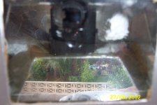 Detalle, vemos la cámara arriba, el espejo abajo ( se ve un trozo del jardín del vecino ), lleva un cristal por delante cerrando la caja. Lo siento pero la foto no conseguí mejorarla. |