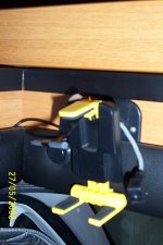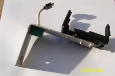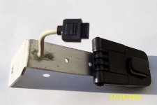 | Detalle del soporte del PDA por delante, hecho con Aluminio de 3 mm, un porta teléfonos de Aurgi, y el conector de Gomadic | Vista de lado con las patas desplegadas y donde vemos el conector que uniremos al salpicadero |