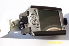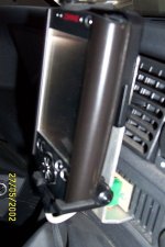 | Vista de la TV con Autoroute 2002 y el PDA con OziCE, ambos en orden de marcha | PortaGPS, el mismo soporte que para el PDA, solo que cogido a una moldura, sin tornillos, los cables vienen por dentro de la moldura |