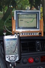 Y ya puestos, modifique todo lo referente al GPS, empezando por la incorporación de una antena reradiante en el exterior, de forma que ahora siempre tengo muy buena cobertura ( excelente ). El gps no me es necesario desmontarlo en cada parada, pues queda oculto por la cortina, la sujeción del PDA, ahora rapidísimo de quitar y poner, por supuesto la nueva pantalla, el añadido de un mini teclado con las principales funciones de los navegadores, un teclado inalámbrico para crear rutas, y un PC Pentium 166, que acabo de sustituir por un Pentium III a 450, y con ayuda de un programita de macros de teclado he automatizado todo lo que respecta a la puesta en marcha, ( si no tengo que modificar la ruta solo tengo que pulsar una tecla y en un minuto o dos tengo todo en marcha con mi posición, ruta a seguir etc. comodísimo.) y solucionado el problema de los zoom en el Route 66 2003, que había que hacerlos con ratón o con combinaciones de teclas. Con este programita puedo permitirme hasta el cambiar de programa en plena marcha con solo pulsar una tecla, los programas que uso en el PC son Route 66 2003 ( mejor cartografía y actualiza cada segundo ), Autoroute 2002 ( digamos que mas facilidad de uso, segun en que, pero no le perdono lo de los 15 seg para actualizar ), y como no, mi querido OZI, para cuando voy por zonas alejadas del mundo ( aunque según el sitio no hace falta que sea poco conocido para considerarlo así por parte de los otros dos programas )