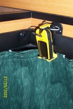 | GPS montado, lo que se ve arriba del GPS es la antena de la reradiante, el cable de datos y alimentación por detrás. Como se puede ver, cuando corro la cortina de la cabina queda oculto. | En el hueco porta paquete de tabaco metí el receptor del teclado inalámbrico, tuve que hacer un agujero de 5 mm atrás arriba para pasar los cables, sin el receptor no se ve el agujero. |