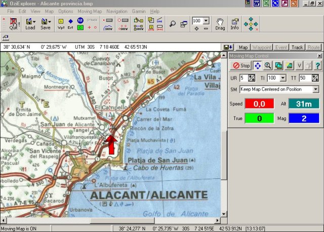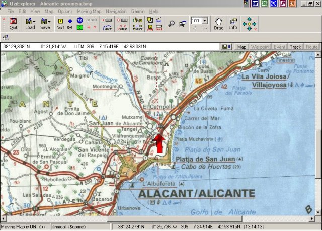 Aqui tenemos una copia de la pantalla de OziExplorer, la punta de la flecha nos indica el punto exacto donde nos encontramos, y la flecha asimismo nos indica la dirección que llevamos