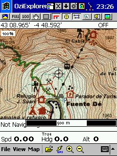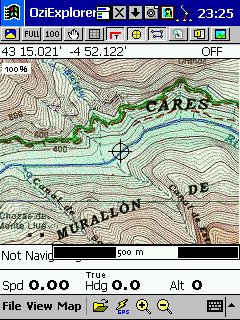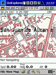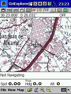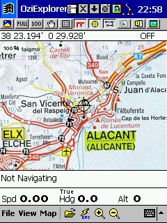 Versión PocketPC, lo que hacemos es utilizar los mismos mapas calibrados en su versión PC, y todos los datos que hayamos creado, desde esta versión no podemos crear rutas, tendremos que haberlas creado previamente en el PC. Los mapas son los mismos, pero hay que hacer una conversión con un programita que lo hace todo el solo, los ficheros de calibración ( *.map ) podemos modificarlos abriéndolos con el bloc de notas y sustituyendo la extensión del fichero grafico por la extensión ozf2 en los dos sitios que aparece, de esta forma tan simple nos evitamos tener que calibrarlos de nuevo, yo después lo guardo como y en el nombre añado oz justo antes de la extensión ( ???oz.ozf2 ) de esta forma los distingo, es importante que aunque con los ficheros ozf2 podemos trabajar en PC y en PDA no borrar el original, pues ozf2 no lo admite ningún programa de gráficos, y por lo tanto no podríamos hacer modificaciones o correcciones del mapa. También es importante mantener en la misma carpeta el fichero grafico y su correspondiente *.map, de esta forma siempre lo encontrara. Esta versión para PDA prácticamente lo único que hace es moving-map, en su ultima versión se ha añadido navegación, así mismo va guardando todos los datos que va recibiendo del GPS y nos muestra en pantalla varios datos al mismo tiempo, es además el que mejor uso hace de la pantalla táctil del Pocket PC. Admite en la actualidad GPS del tipo compact Flash y similares, y al igual que su versión PC busca el mapa adecuado el solo.